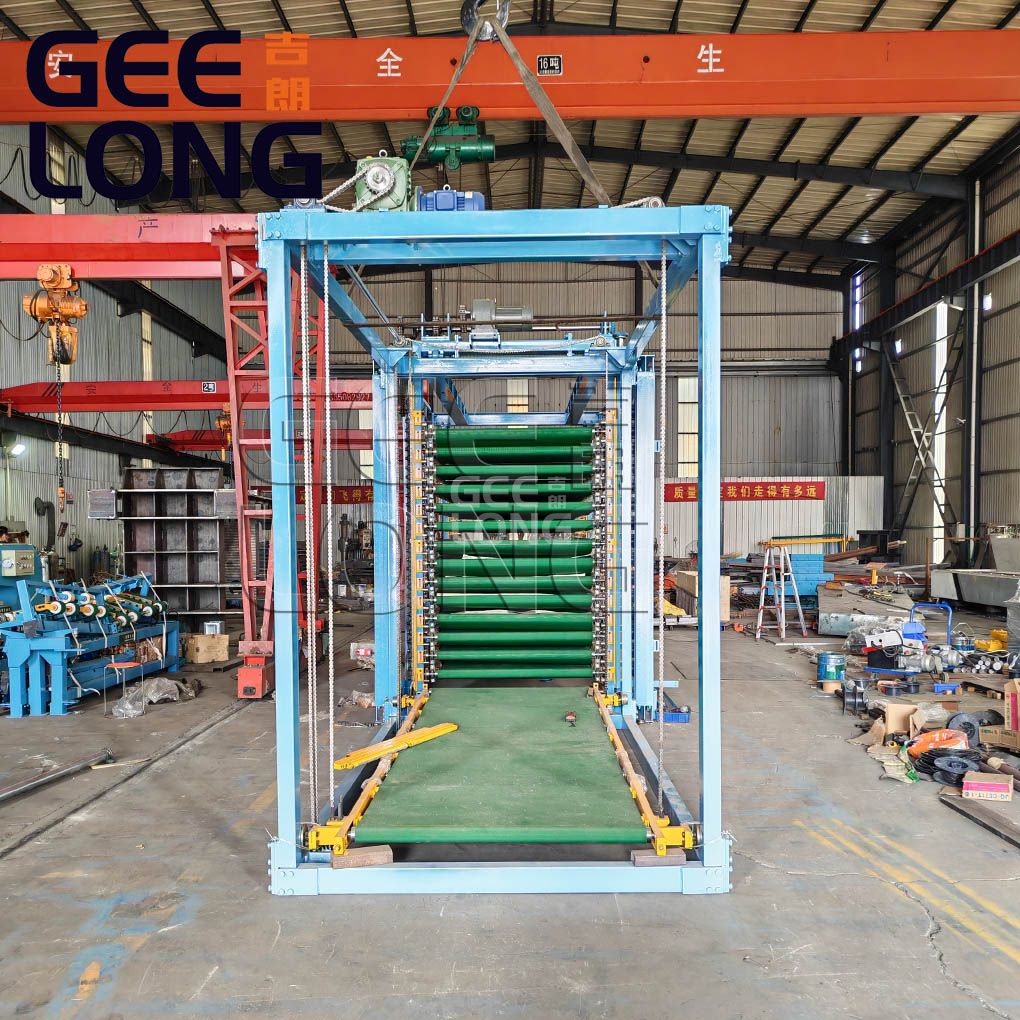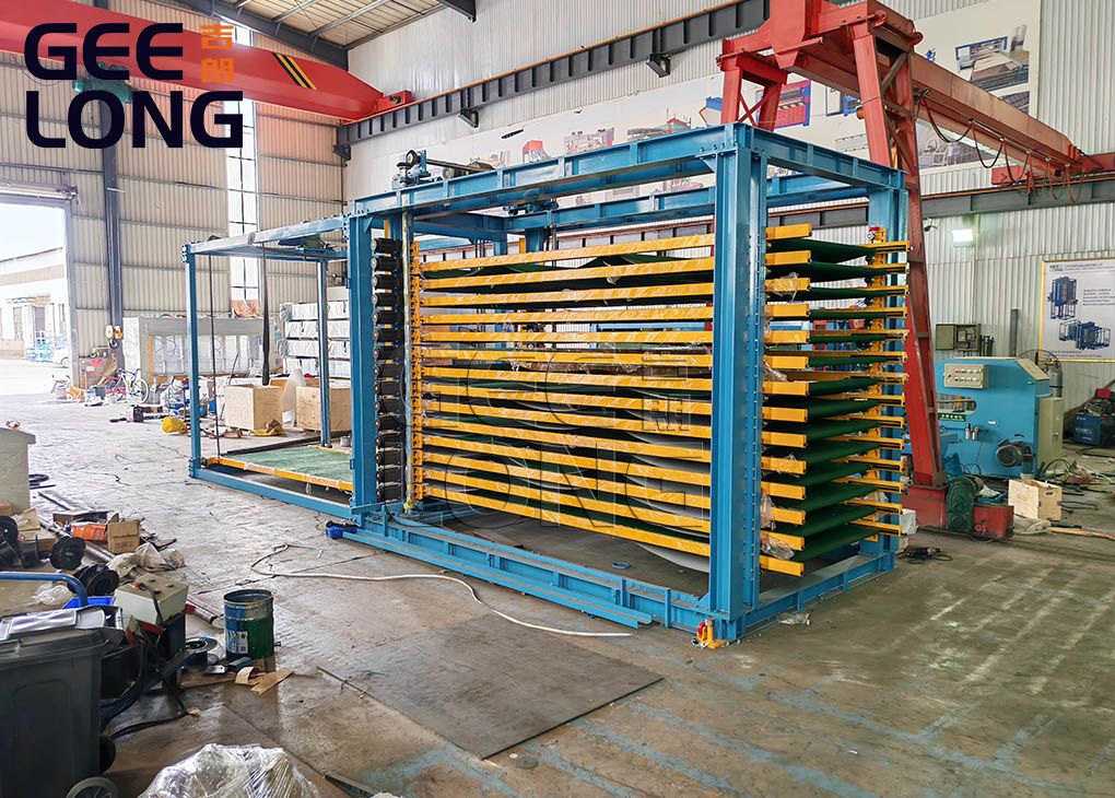 Chargeur de bande vertical à 10 couches pour machine de presse à chaud en contreplaqué filmé, cette machine est utilisée pour charger le panneau et le film noir dans la machine de presse à chaud en contreplaqué, peut réaliser une stratification de papier face film double face, le produit fini est du contreplaqué filmé, machines geelong peut également donner la solution complète pour le chargeur à bande 10 couches, la machine de presse à chaud pour contreplaqué, le support de refroidissement, le lève-panneau, peut également donner la solution pour la ligne de pressage à chaud automatique de contreplaqué à film si vous en avez besoin.